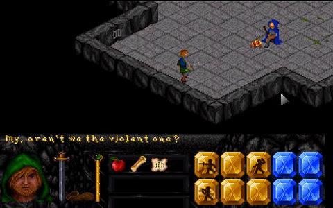 The user-interface is one of the crowning achievements. The game is real-time, and most of the display is dedicated to a perspective view of the character and his or her surroundings. This is an "overhead and to the right" type of view. The overhead view scrolls smoothly as the character moves, keeping the character more-or-less centered. The bottom tenth of the screen is dedicated to a portrait of the character, a couple of lines of inventory, and the status of his hands (with readied weapons), and spells. This status display can be grabbed with the mouse and extended (like pulling down a shade), making the rest of the character's inventory available, as well as displaying experience information, and a detailed display of the character's body to show armor in use and readied weapons. The player interacts with inventory items by grabbing them with the mouse and moving them to the character's body. Most items must be held in either hand to be used. Things that are worn are "dropped" onto the character's body and become part of the display both at the portrait level and on the overhead view (ie, when you put on a helmet, both the detailed body display and the overhead view of the character shows the helmet).